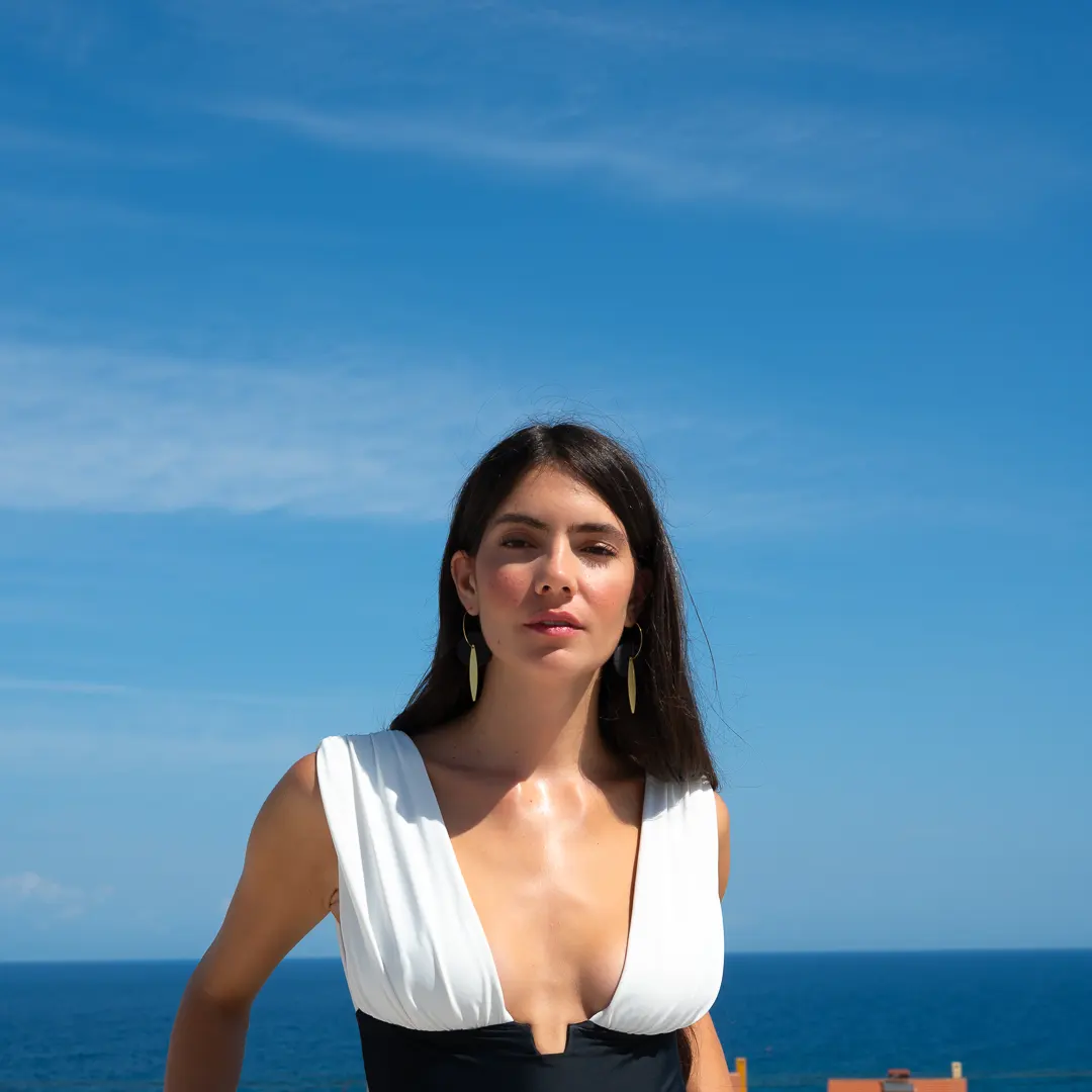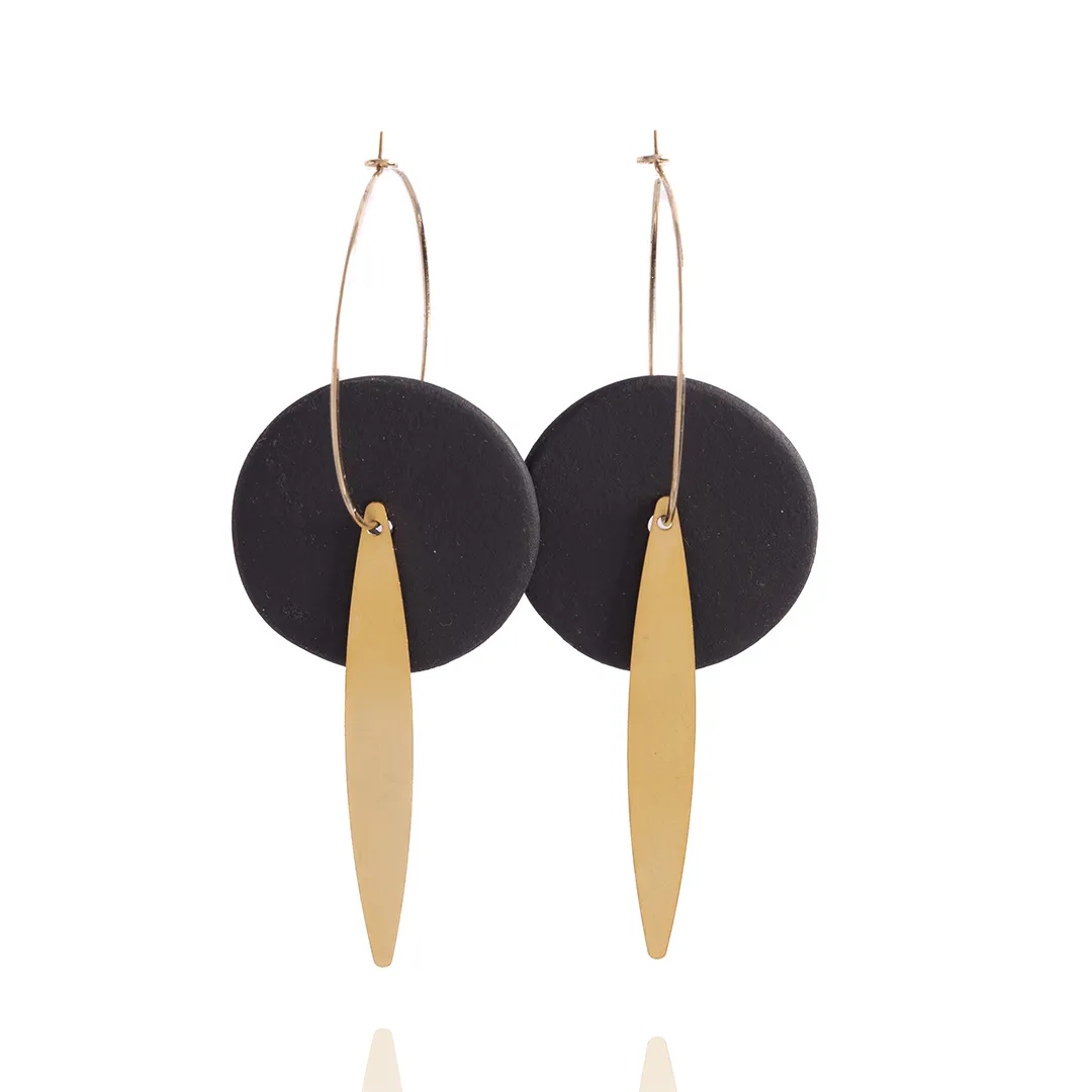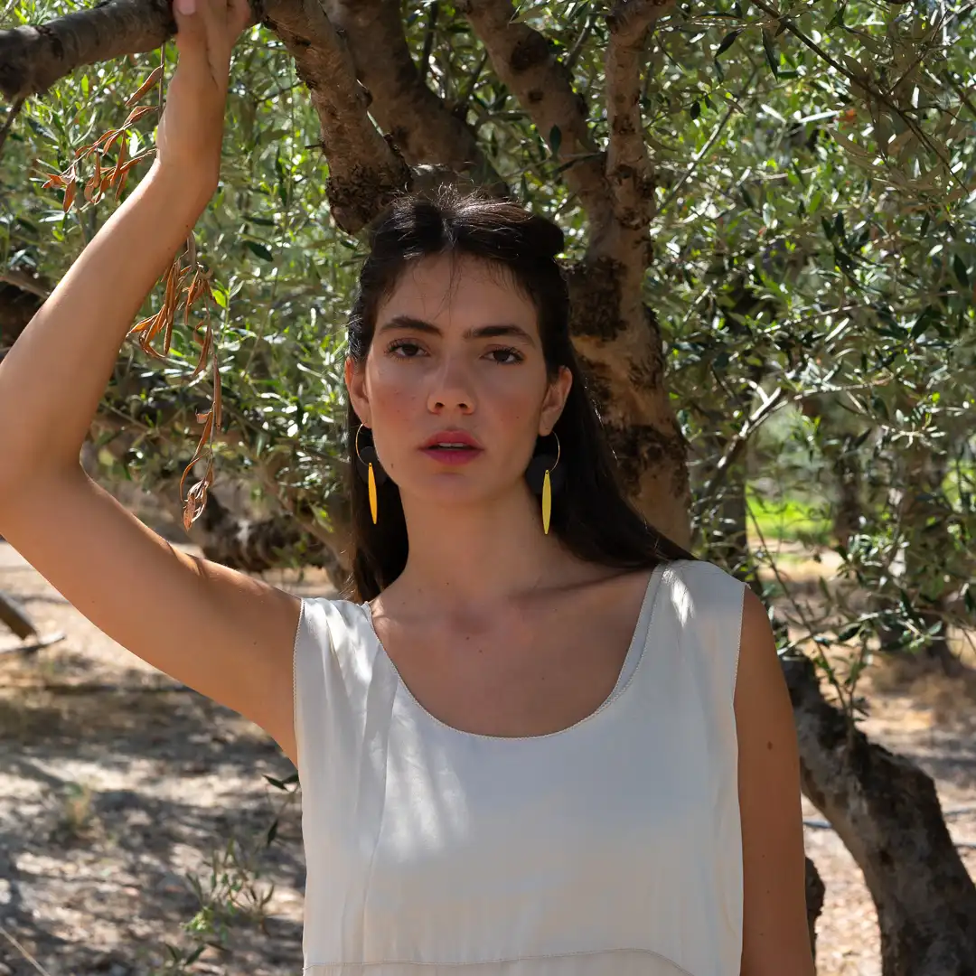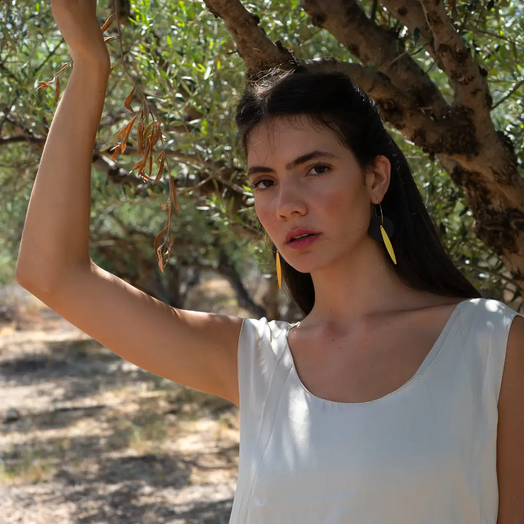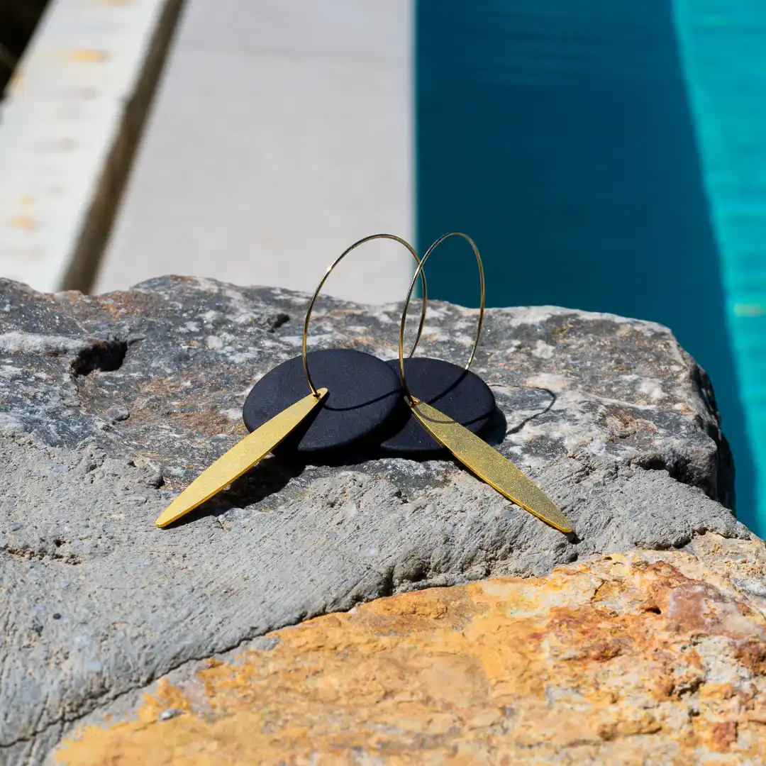 Ces élégantes boucles d’oreilles sont inspirées par les champs d’oliviers qui recouvrent les paysages en Grèce. Elles se composent d’un disque en grès brut de couleur noire et d’un délicat pendentif doré à l’or mat qui symbolise une feuille d’olivier. Le mariage de ces deux éléments qui se superposent crée un spectaculaire contraste de matières et de couleurs.