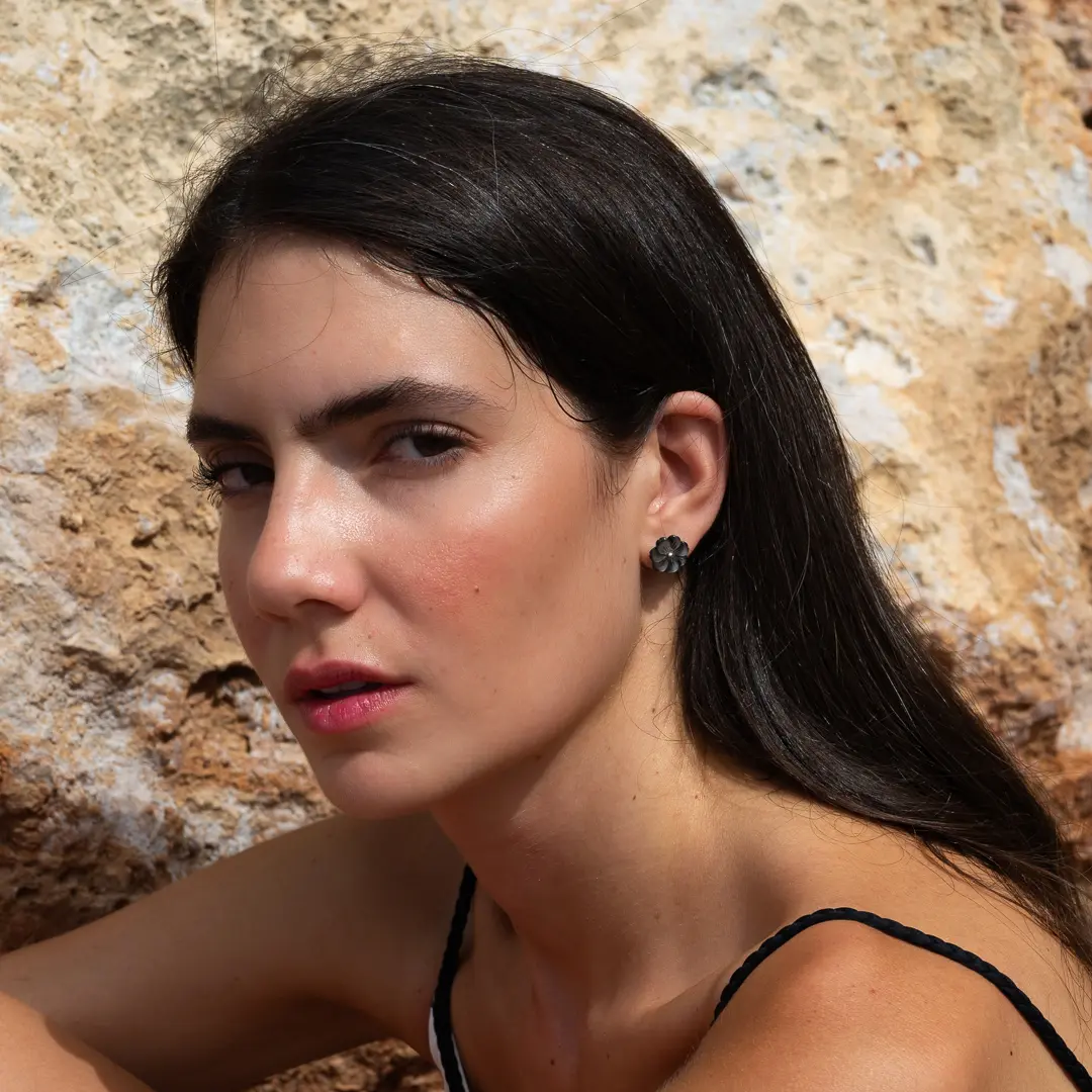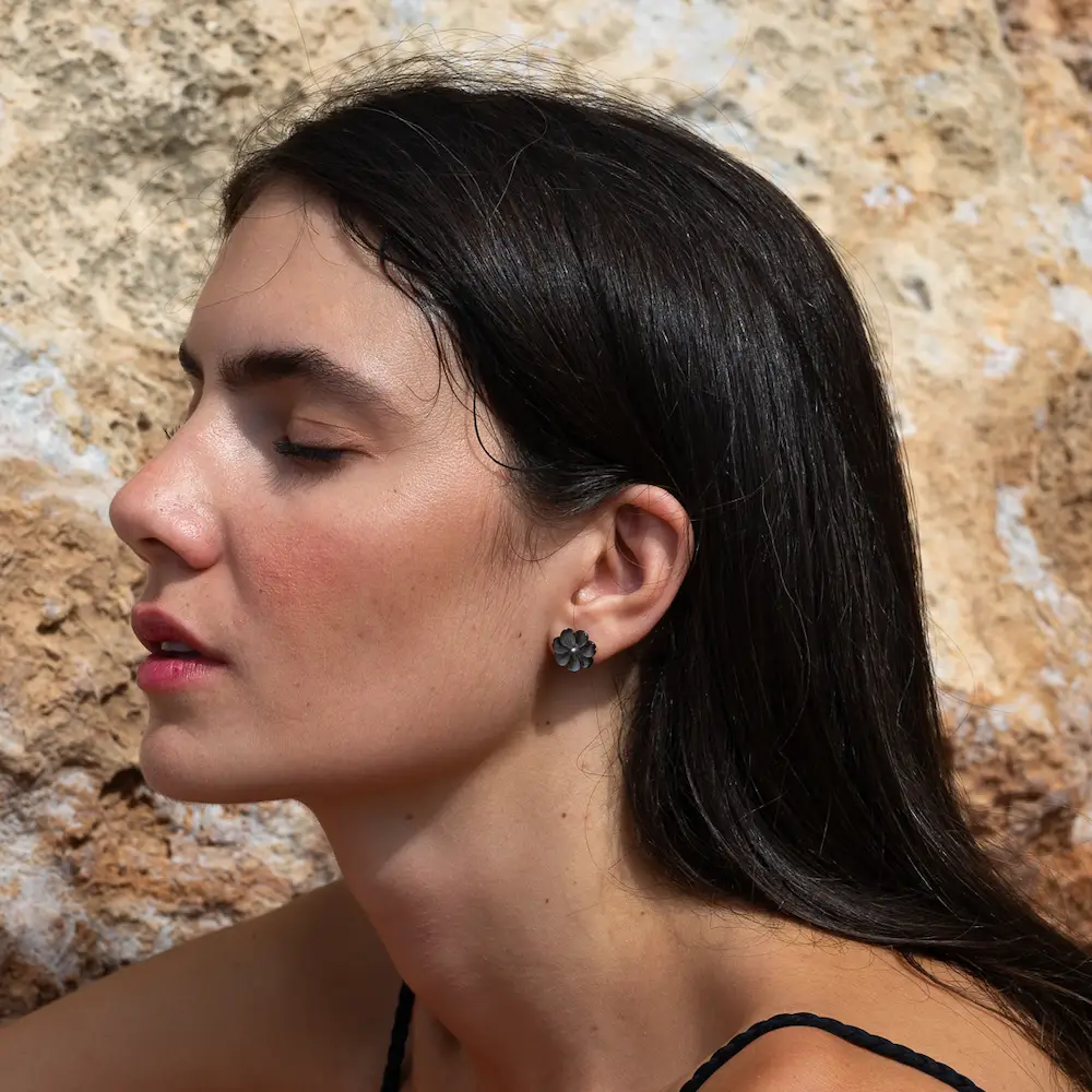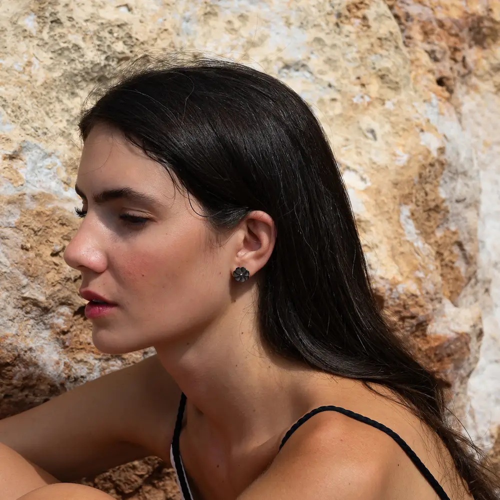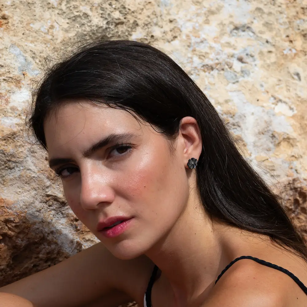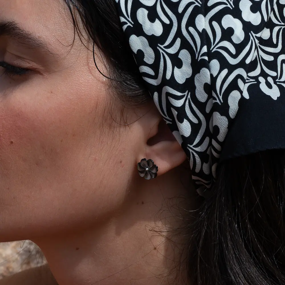 Les clous d’oreilles sont en argent 925 et la fleur d’Hibiscus en nacre naturelle, sculptée à la main.