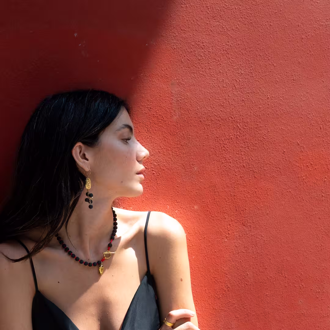 Le côté organique et brut des perles de couleur noire se mêle au classicisme raffiné de la médaille dorée à l’or mat, créant un style vibrant et irrésistible.