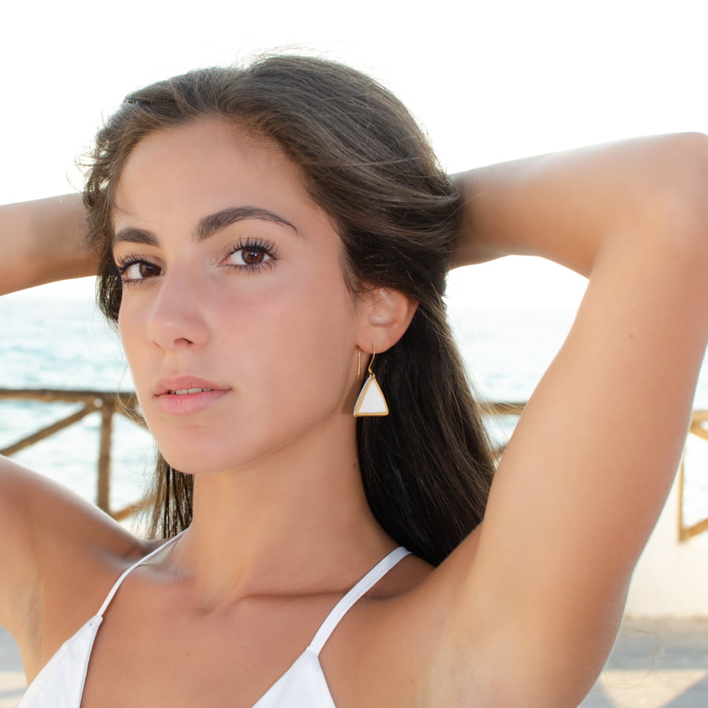 Boucles d’oreilles Lydia, de la collection Gizeh. Médaillon en forme de pyramide d’environ 2,5 cm de hauteur, porcelaine blanche et liseré d’or fin sur le pourtour.