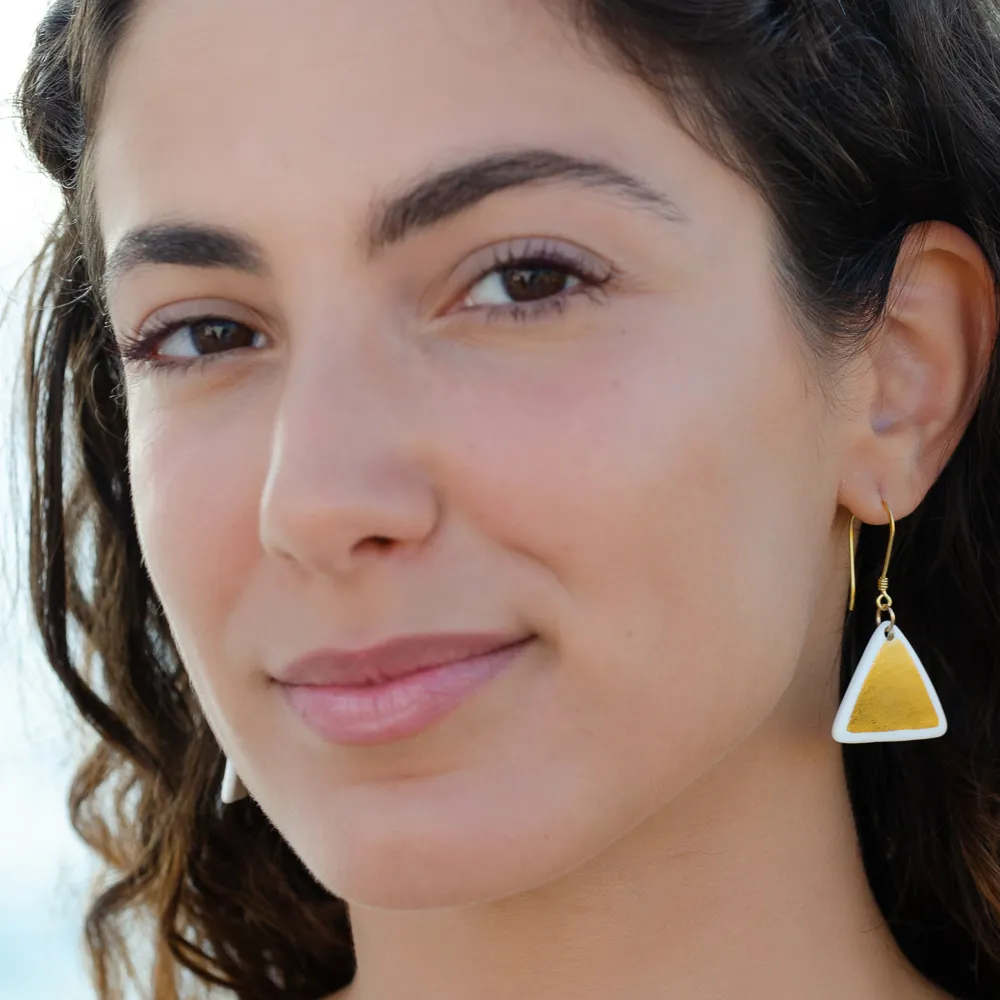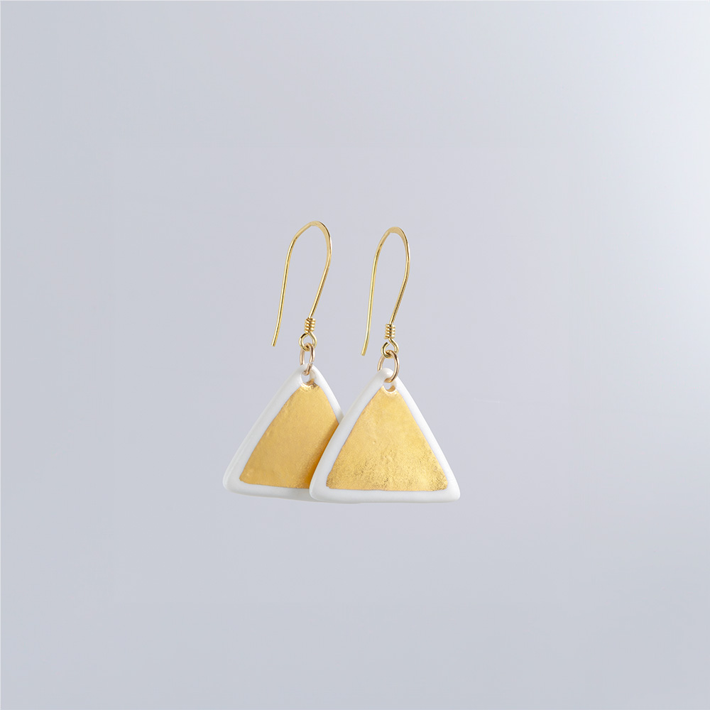 Boucles d’oreilles inspirées des pyramides égyptiennes en porcelaine blanche ornée d’or fin d’environ 2,5cm de hauteur.