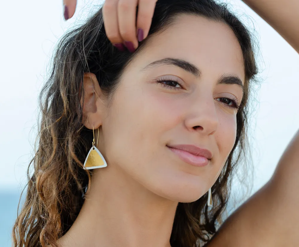 Je vous présente ici les boucles d’oreilles en céramique et or… Ophélie. Elles appartiennent à la collection Gizeh, mon interprétation libre des Pyramides égyptiennes, tout comme Irène, Lina, Bérénice ou les colliers Agathe, Eugénie ou encore Europe.