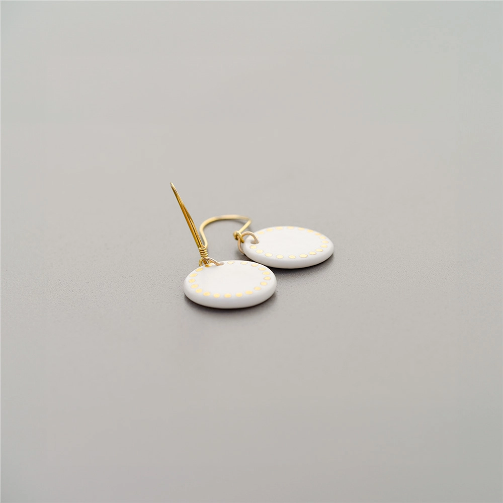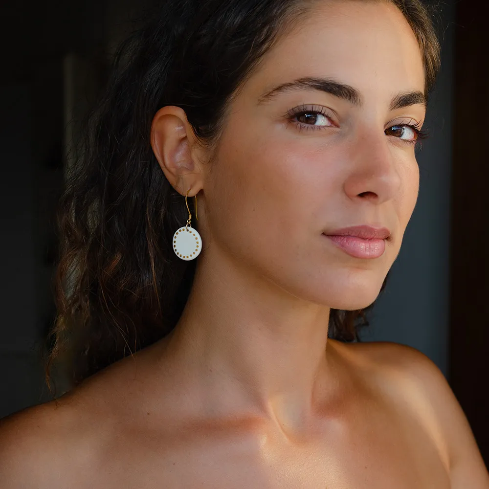 Découvrez les boucles d’oreilles Théa, le mariage subtil d’un médaillon en porcelaine extra blanche et d’or appliqué en délicats pointillés.
