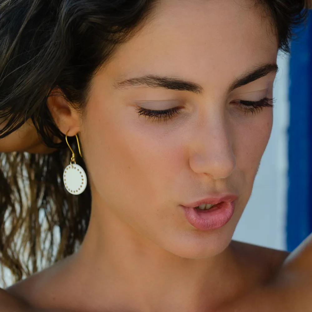 Les Boucles d’Oreilles Théa en Porcelaine et Or, un Bijou pour vous rapprocher du Soleil Grec.