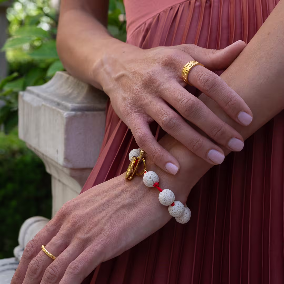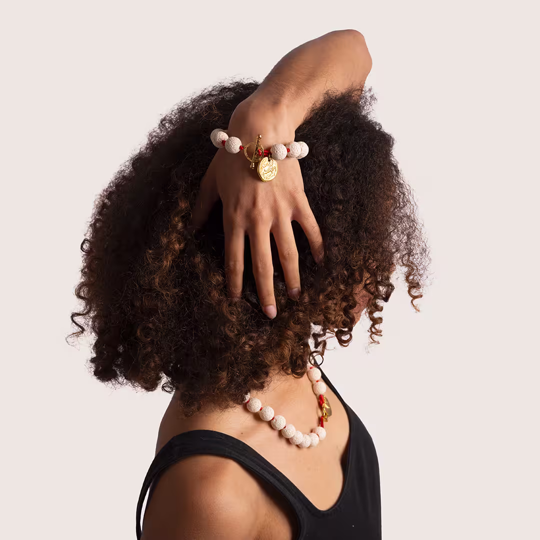 Les perles, façonnées à partir de lave solidifiée provenant des profondeurs volcaniques, sont enfilées sur un fil rouge vif qui crée un contraste élégant. Entre chaque perle, des nœuds faits à la main ajoutent une touche contemporaine et raffinée.