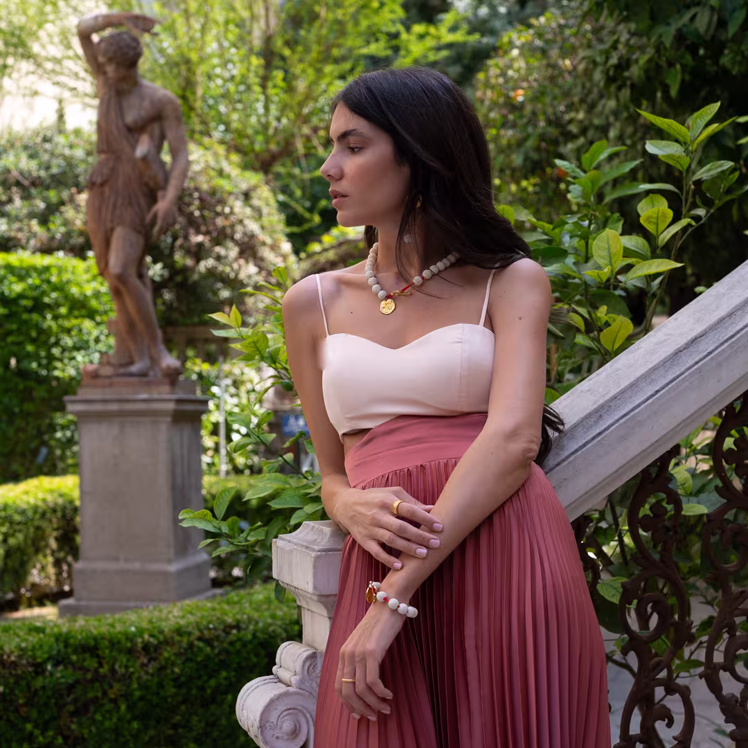 Le bracelet se ferme avec une attache en T, ornée d’une pièce antique, toutes deux finement dorées à l’or fin.