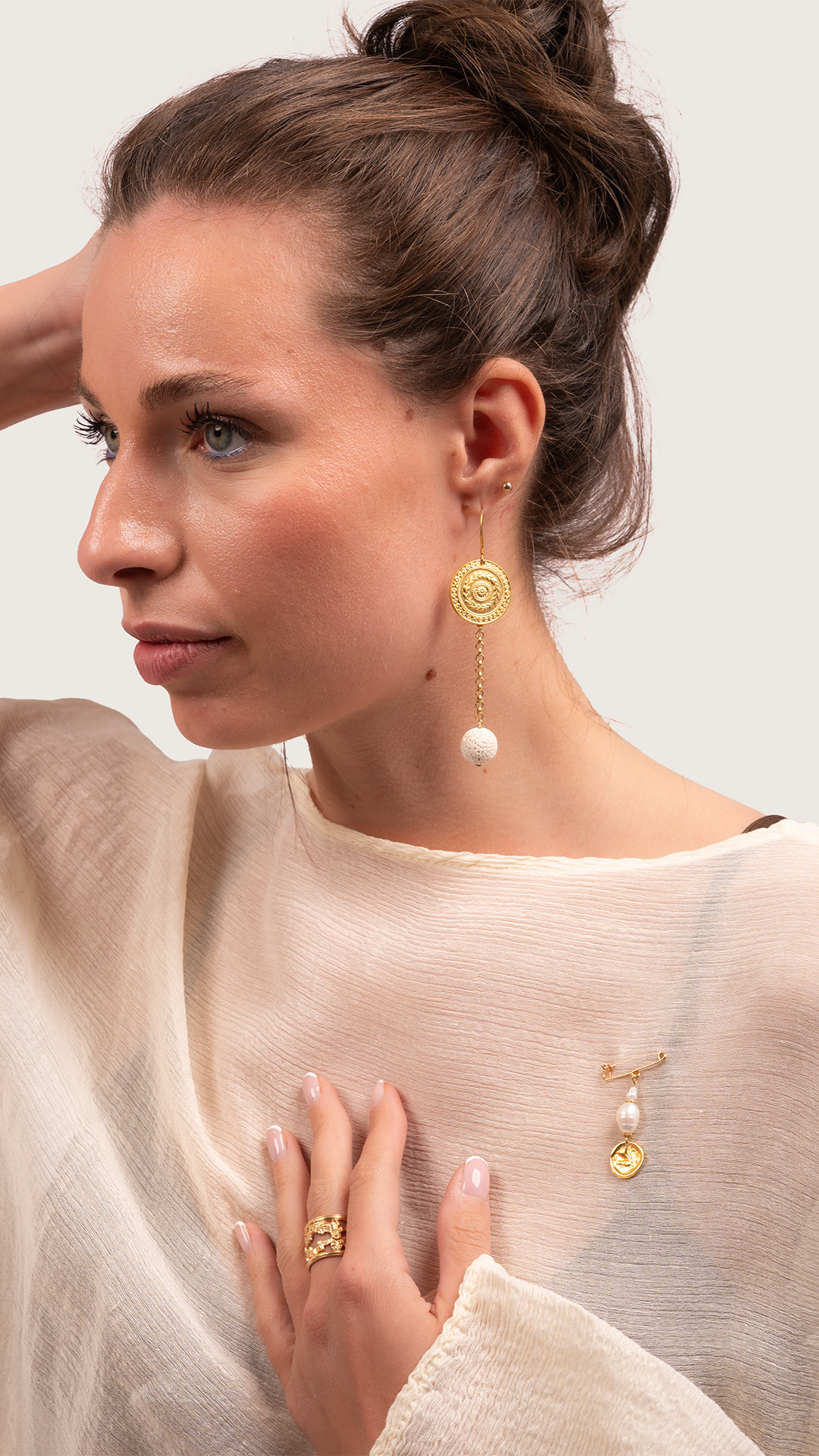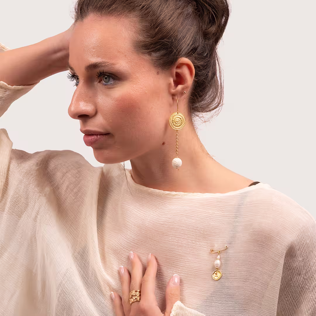 Ce bijou original associe deux véritables perles d’eau douce baroques, au charme irrégulier et naturel, à une médaille inspirée d’une pièce antique. Tous les éléments métalliques – broche, médaille et perles intercalaires – sont dorés à l’or fin, apportant à l’ensemble un éclat précieux.