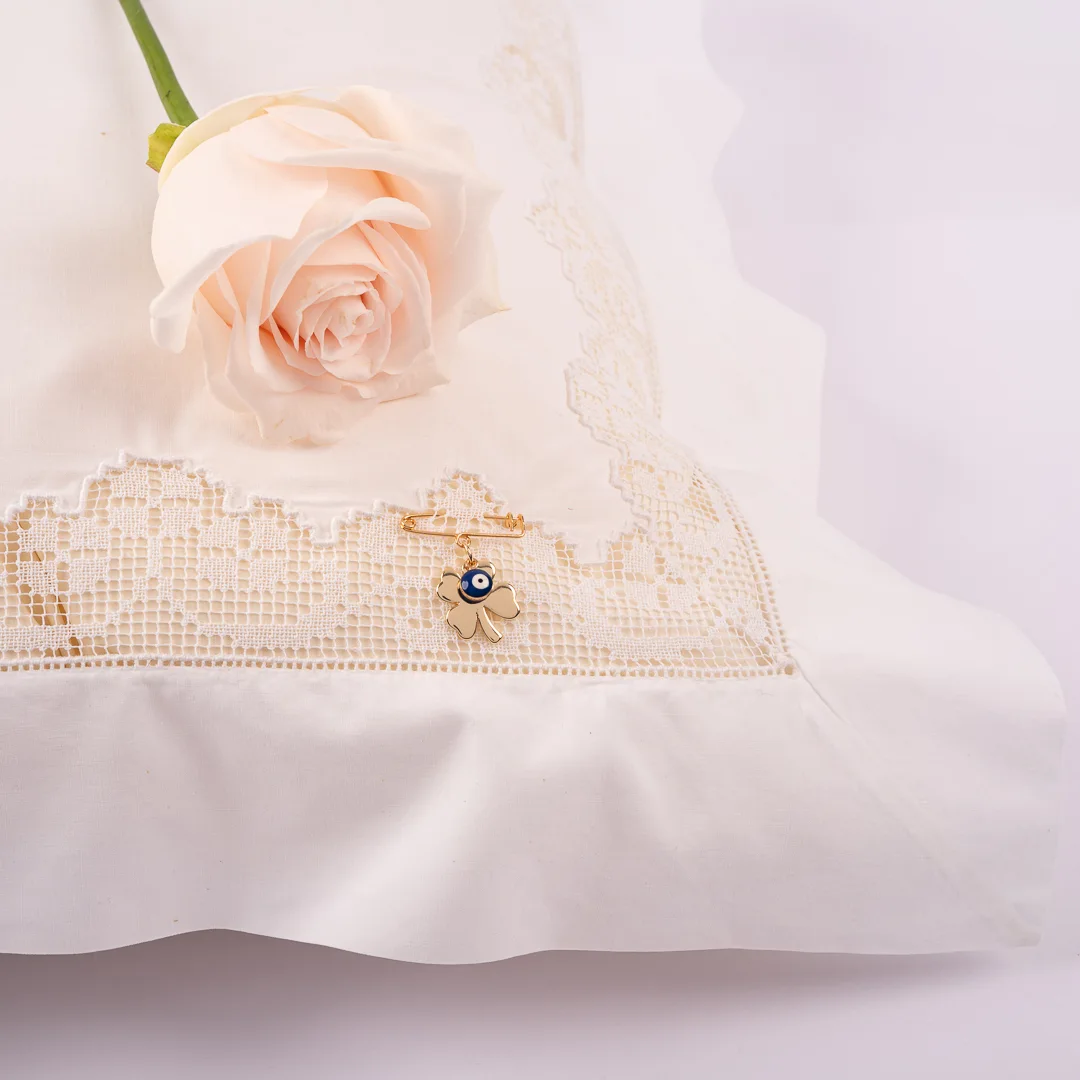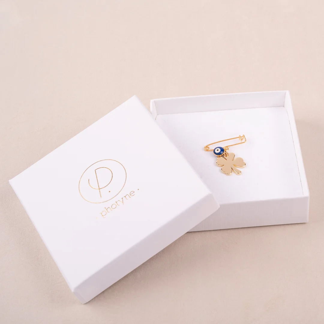 Elle se compose d’une délicate épingle à nourrice sur laquelle sont suspendus un trèfle à 4 feuilles doré à l’or 18 carats, symbolisant la chance, et une breloque émaillée en forme d’œil protecteur.