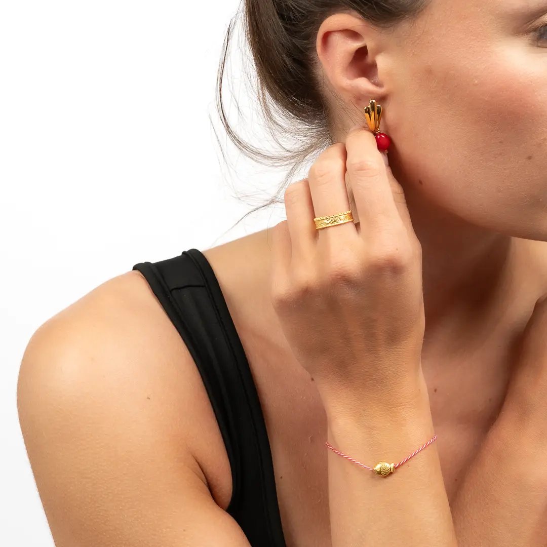 – Une bague au design ethnique, délicatement martelée et dotée d’une bordure perlée, dorée à l’or 24K. Réglable, elle s’adapte à toutes les tours de doigt pour un confort parfait.