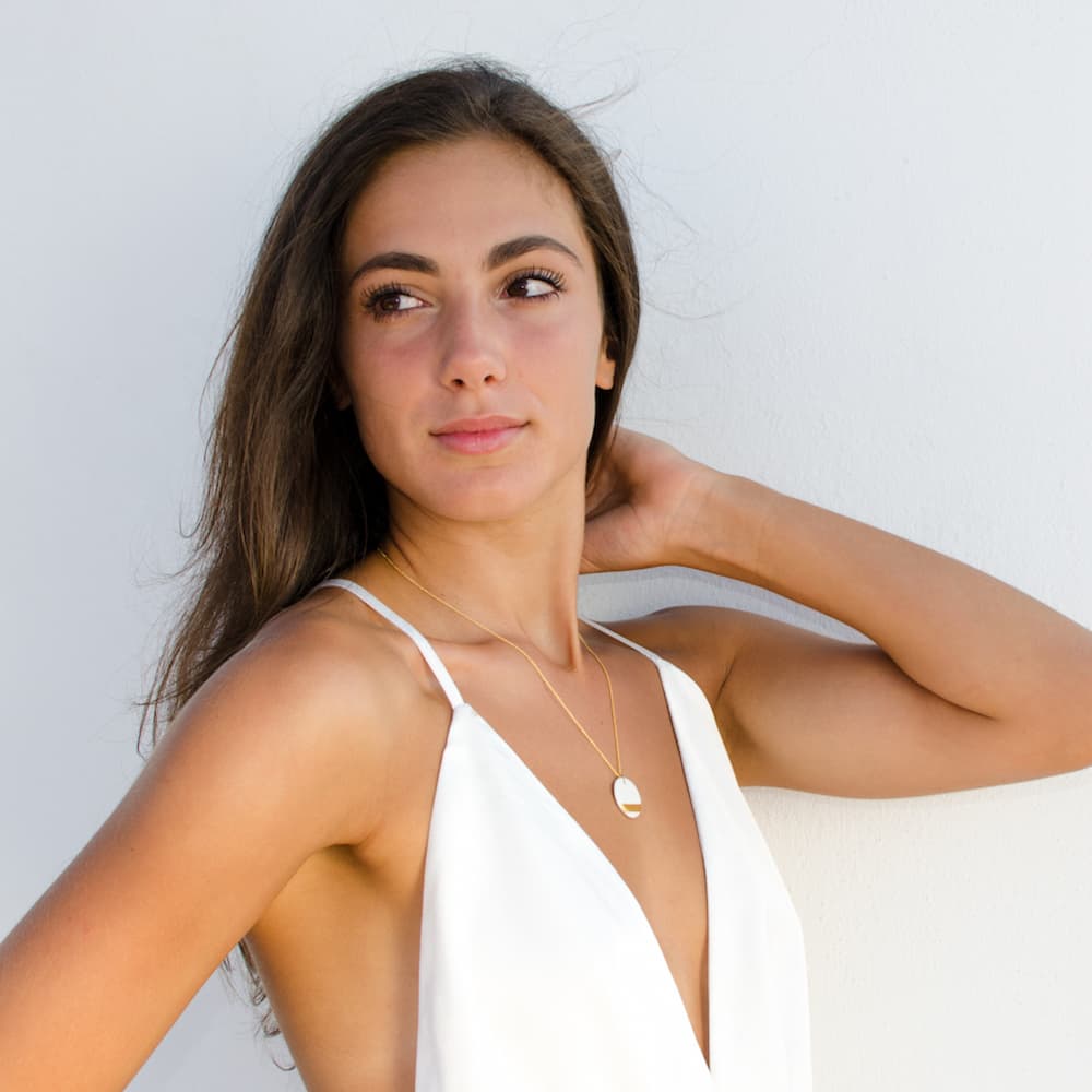 Le collier Athéna, avec son médaillon en forme de disque en céramique peinte à la main à l’or fin sur sa partie inférieure, fait partie lui aussi partie de la collection que j’ai imaginée en pensant à ce compagnon des grecs depuis le commencement des temps : j’ai nommé le soleil.