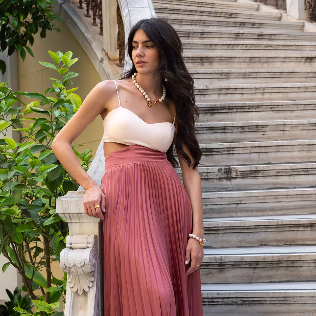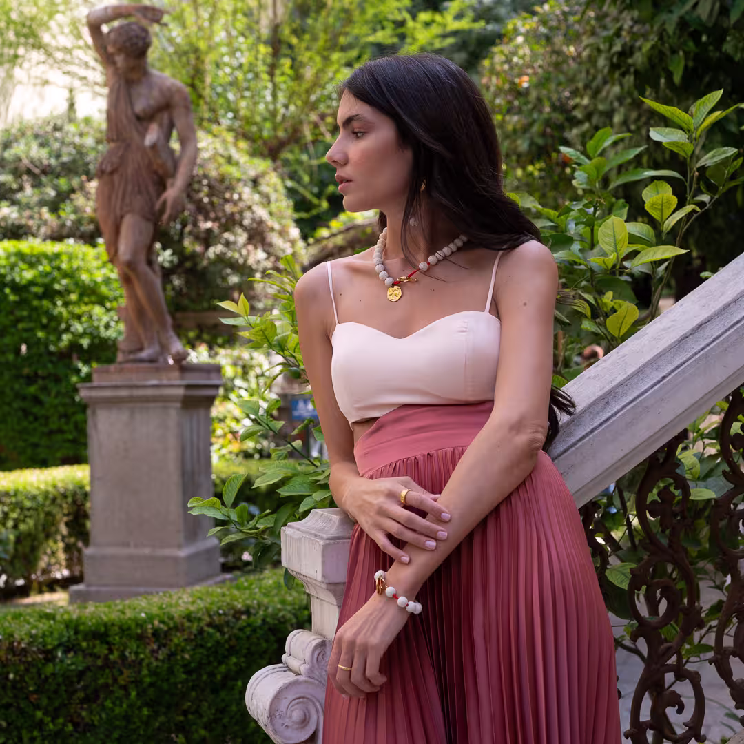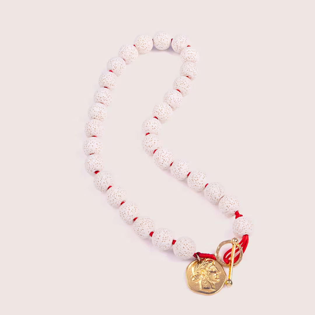 Collier en pierre de lave blanche, inspiré par le célèbre volcan de Santorin, berceau du mythe de l’Atlantide. Ce superbe bijou symbolise l’alliance parfaite entre chic bohème et énergie naturelle.
