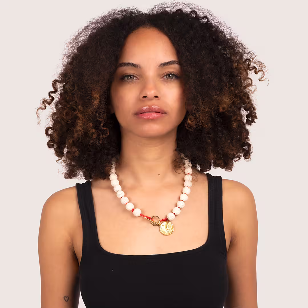 Chaque perle, façonnée à partir de lave solidifiée, est montée sur un fil rouge vif, créant un contraste moderne et vibrant. Entre chaque perle, de délicats nœuds faits à la main ajoutent une note subtile de raffinement, mettant en valeur le caractère artisanal du bijou.