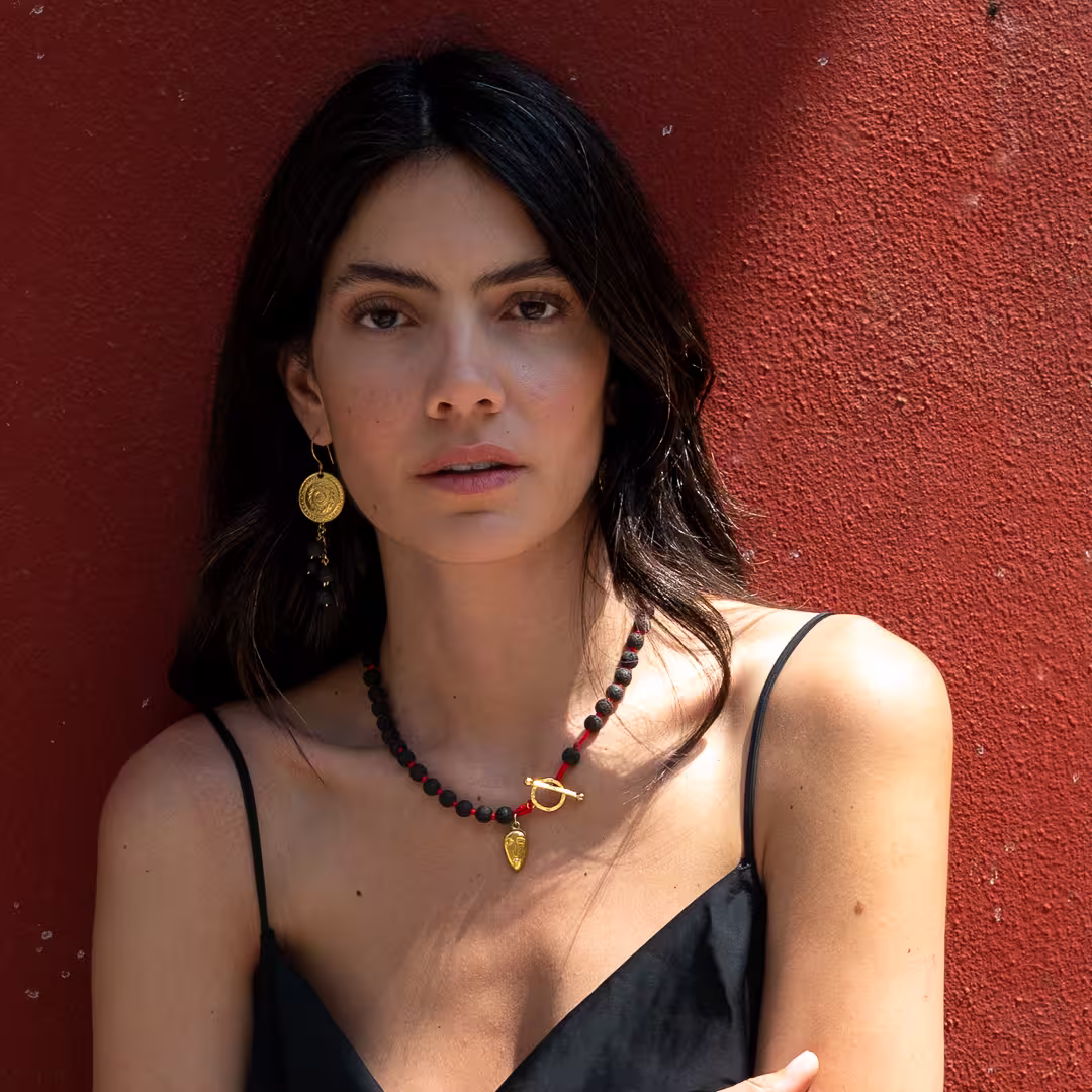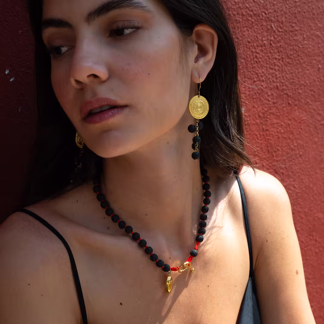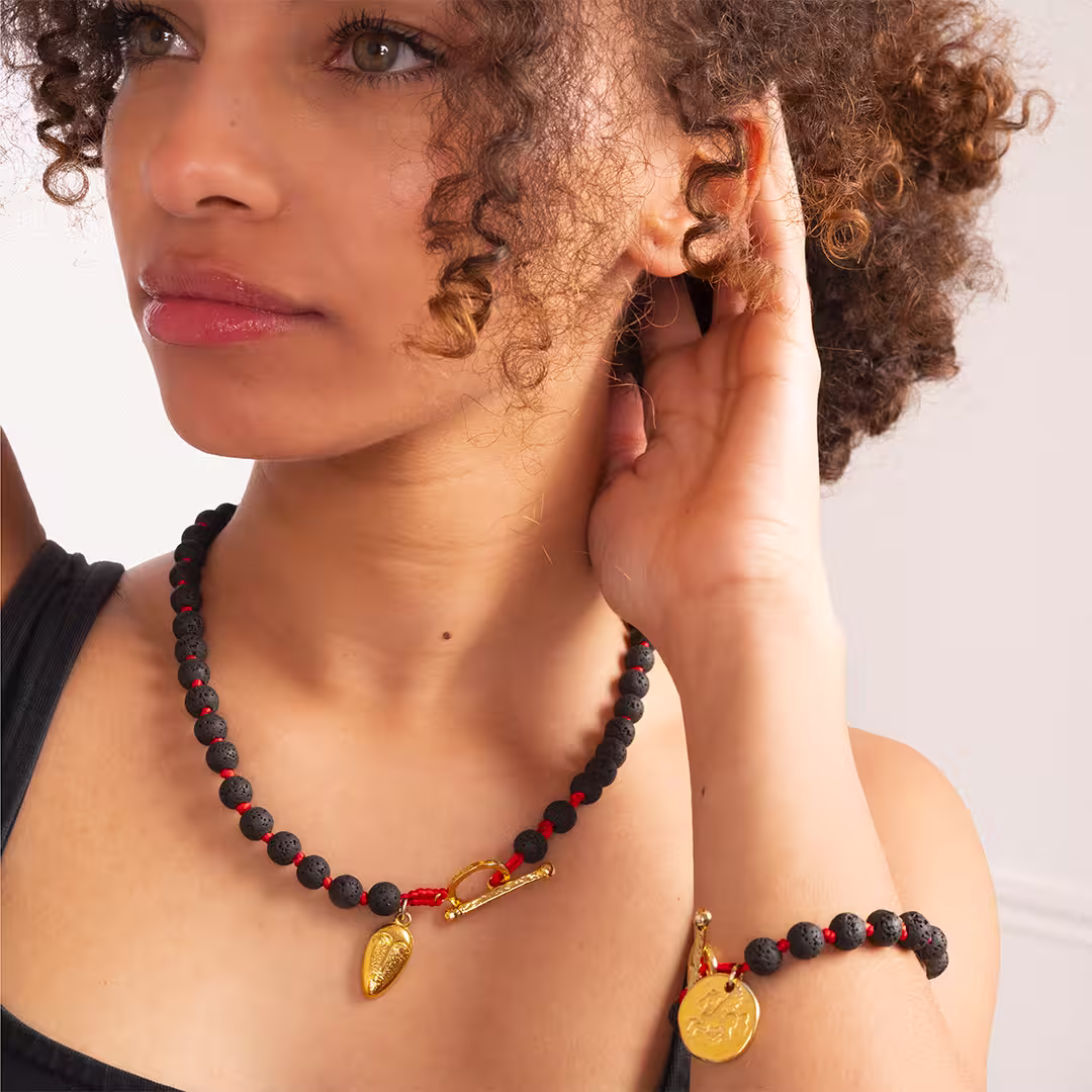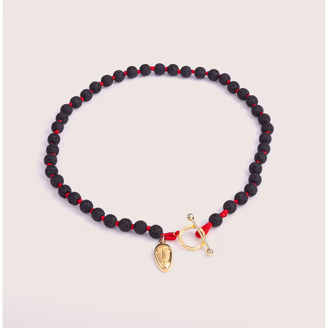 Les perles, créées à partir de lave solidifiée issue des volcans, sont montées sur un fil rouge vif qui apporte un contraste moderne. Entre chaque perle, des nœuds faits à la main confèrent une subtile touche de raffinement.