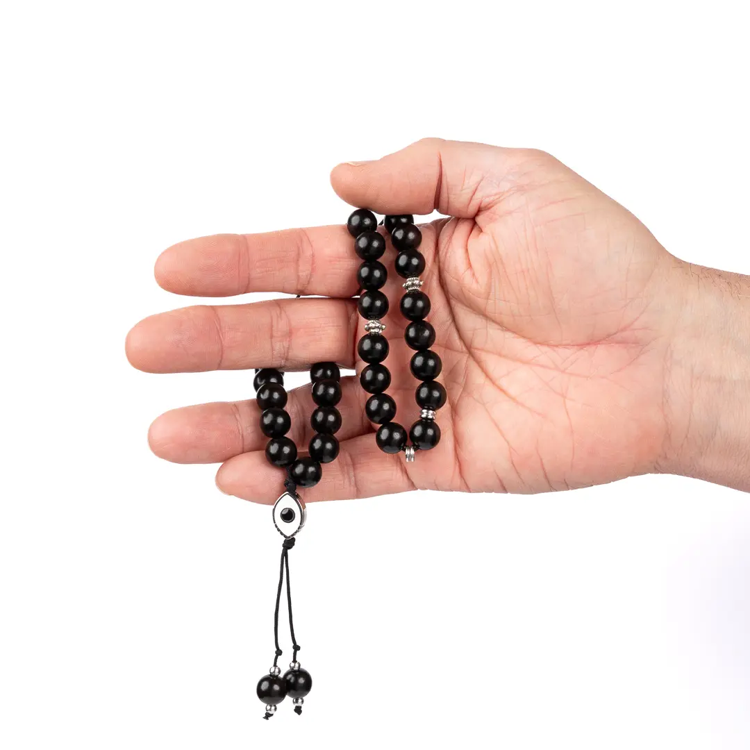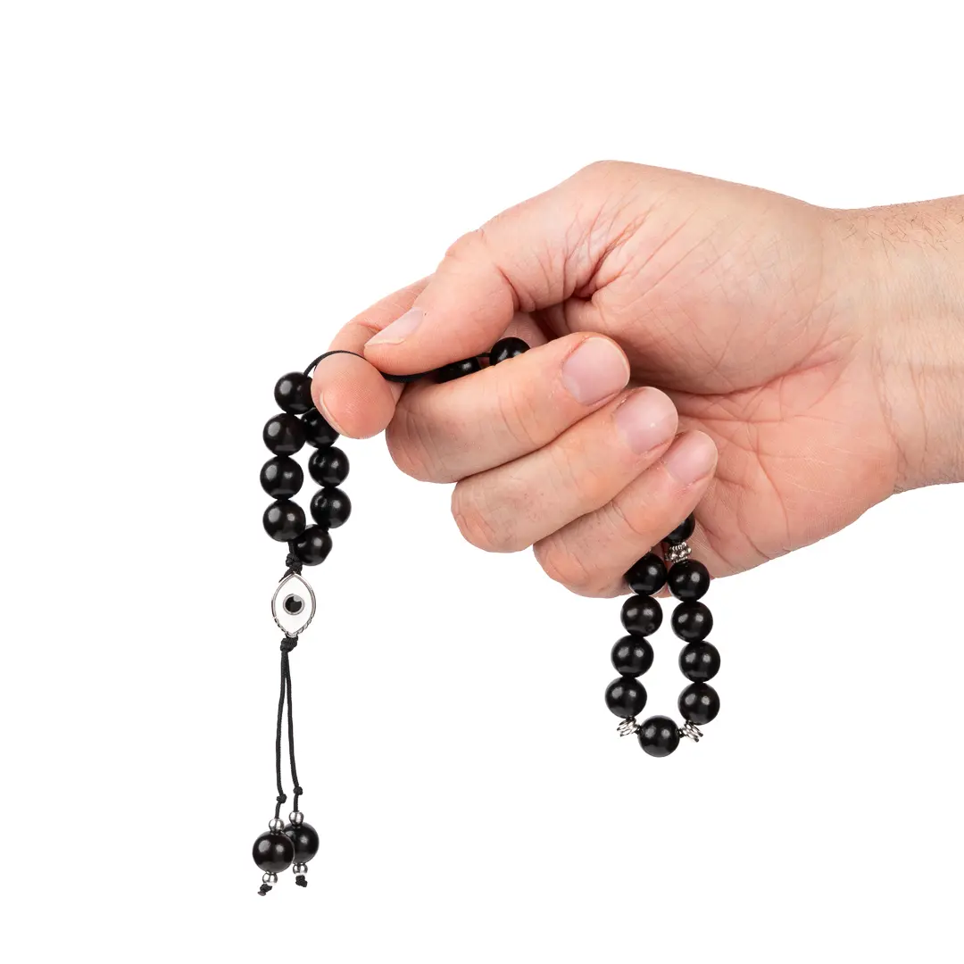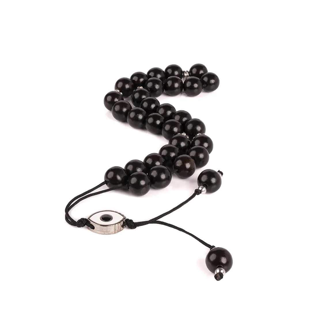 Les perles en bois d’ébène, d’une couleur noire profonde et d’une texture lisse, apportent une sensation de solidité et de naturel. Le contraste avec les perles argentées ajoute une touche de luxe discret, donnant à l’ensemble un éclat raffiné. Sans oublier la perle centrale en forme d’œil, symbole de protection, qui confère une dimension spirituelle au komboloi.
