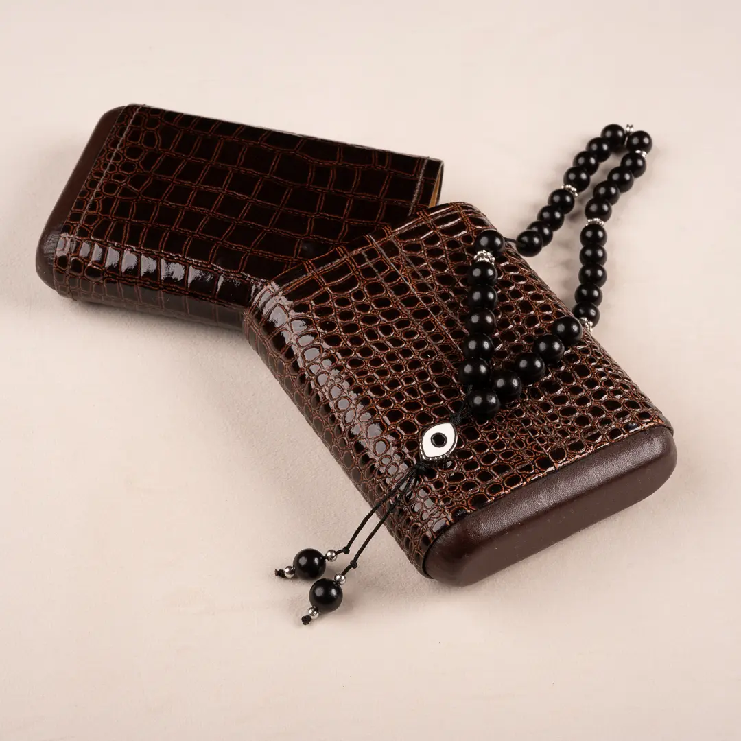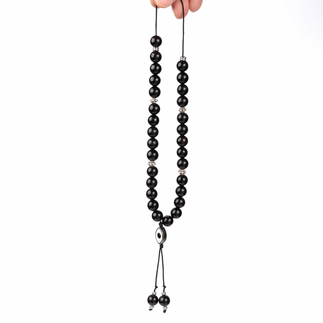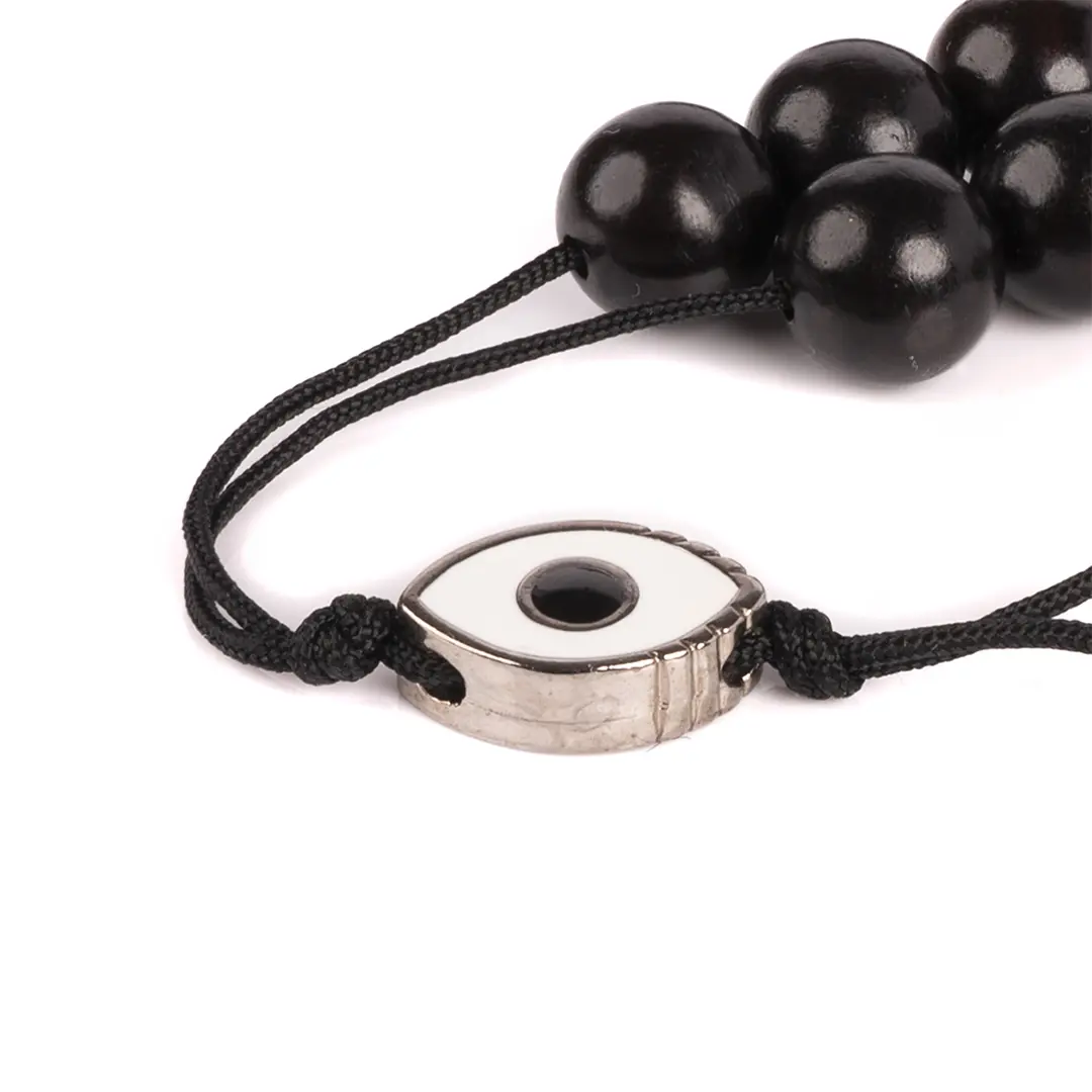 Les perles en bois d’ébène, d’une couleur noire profonde et d’une texture lisse, apportent une sensation de solidité et de naturel. Le contraste avec les perles argentées ajoute une touche de luxe discret, donnant à l’ensemble un éclat raffiné. Sans oublier la perle centrale en forme d’œil, symbole de protection, qui confère une dimension spirituelle au komboloi.