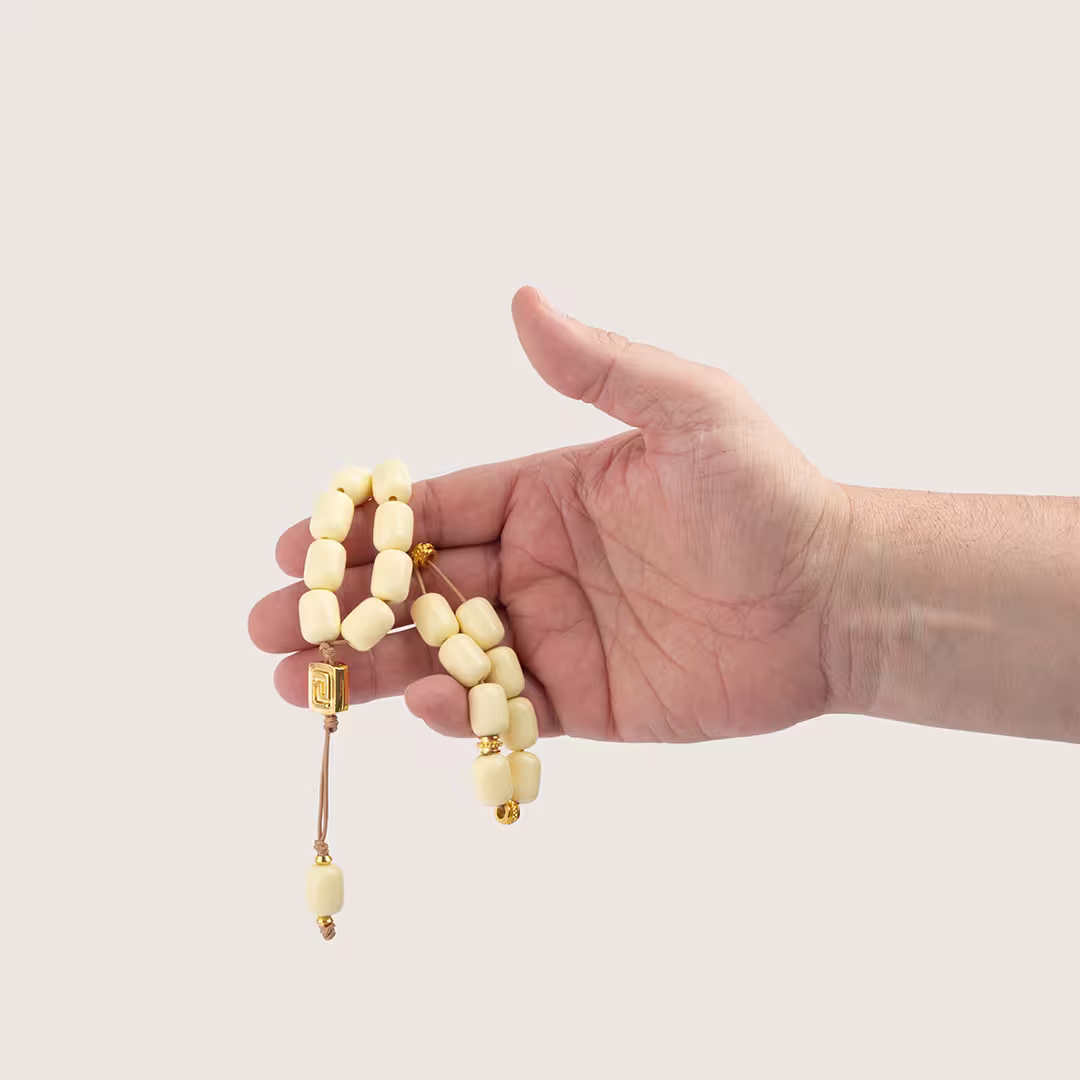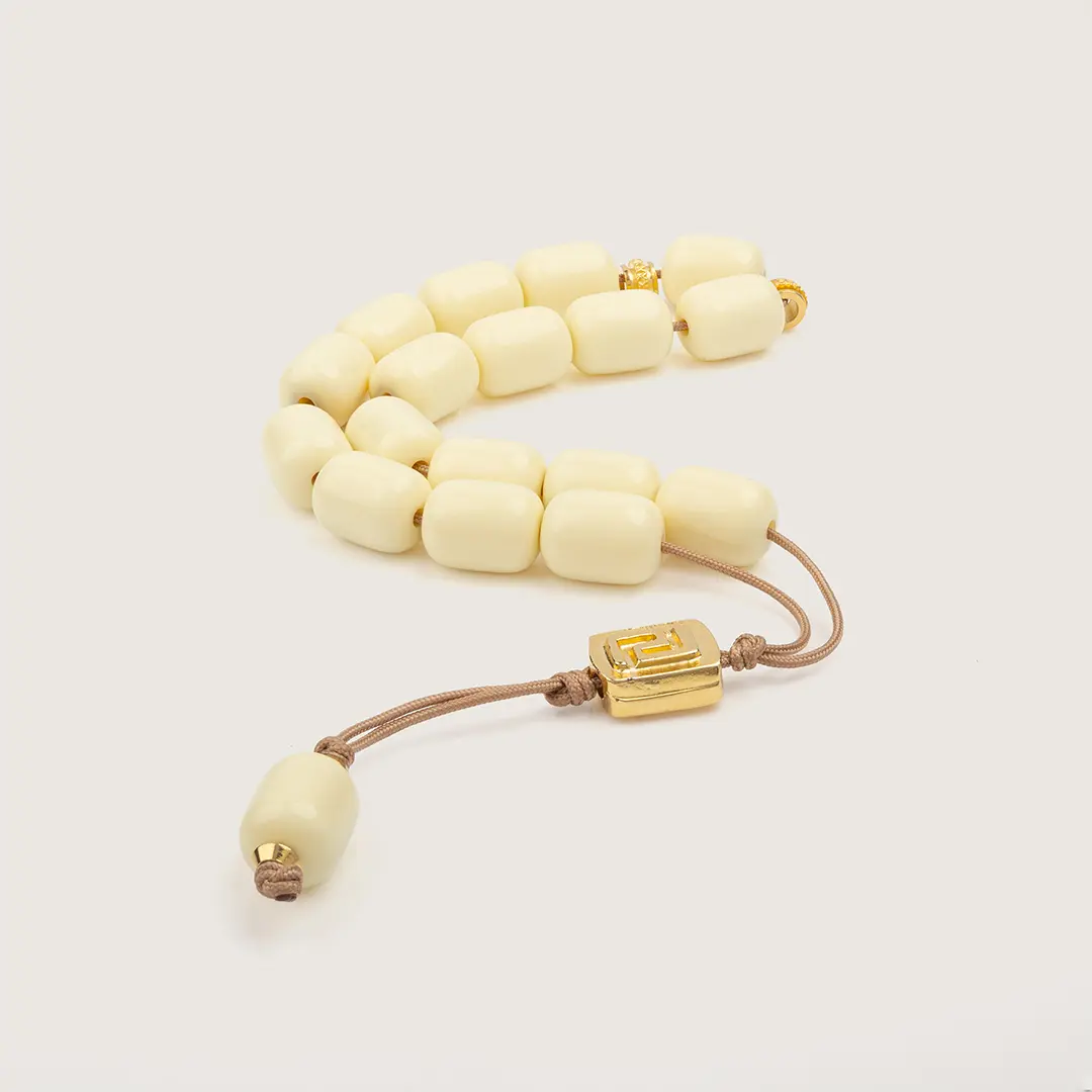 Notre modèle Ivoire est un classique qui allie sobriété et raffinement. Monté sur un fil beige discret, il est composé de perles en résine couleur ivoire, taillées en forme de tonneau pour une prise en main fluide et agréable. De délicats éléments métalliques dorés à l’or fin ajoutent une touche précieuse, tandis que la perle centrale, elle aussi dorée à l’or fin, est ornée du célèbre méandre grec, symbole d’éternité et d’unité dans la culture hellénique.