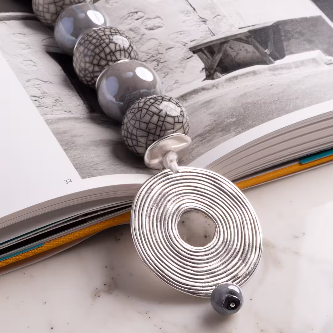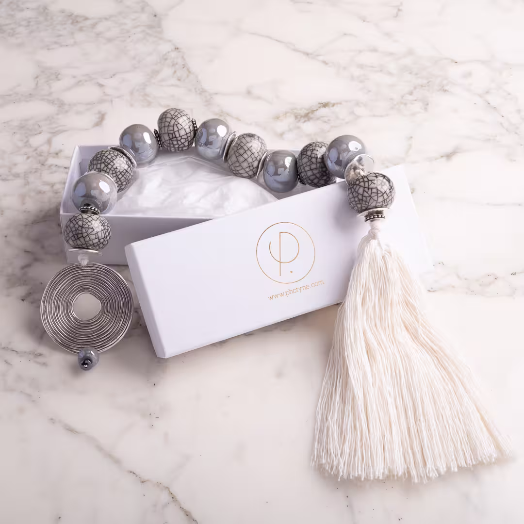 Elégant Komboloi de table, chapelet décoratif composé de 11 perles en céramique grises – en alternance irisées et craquelées- d’une spirale et diéléments en métal argent et d’un pompon. Posé sur une table basse, ou sur tout autre meuble (commode, guéridon…), cet objet de décoration original embellira votre intérieur en lui insufflant une touche de personnalité et de style. Il vous sera livré dans une jolie boite, ce qui en fait un excellent choix de cadeau pour vos proches. Placé dans un endroit bien en vue de la maison, il sera certainement apprécié de tous !