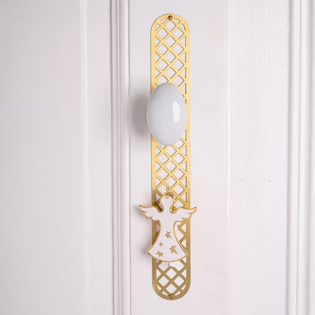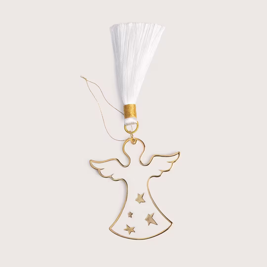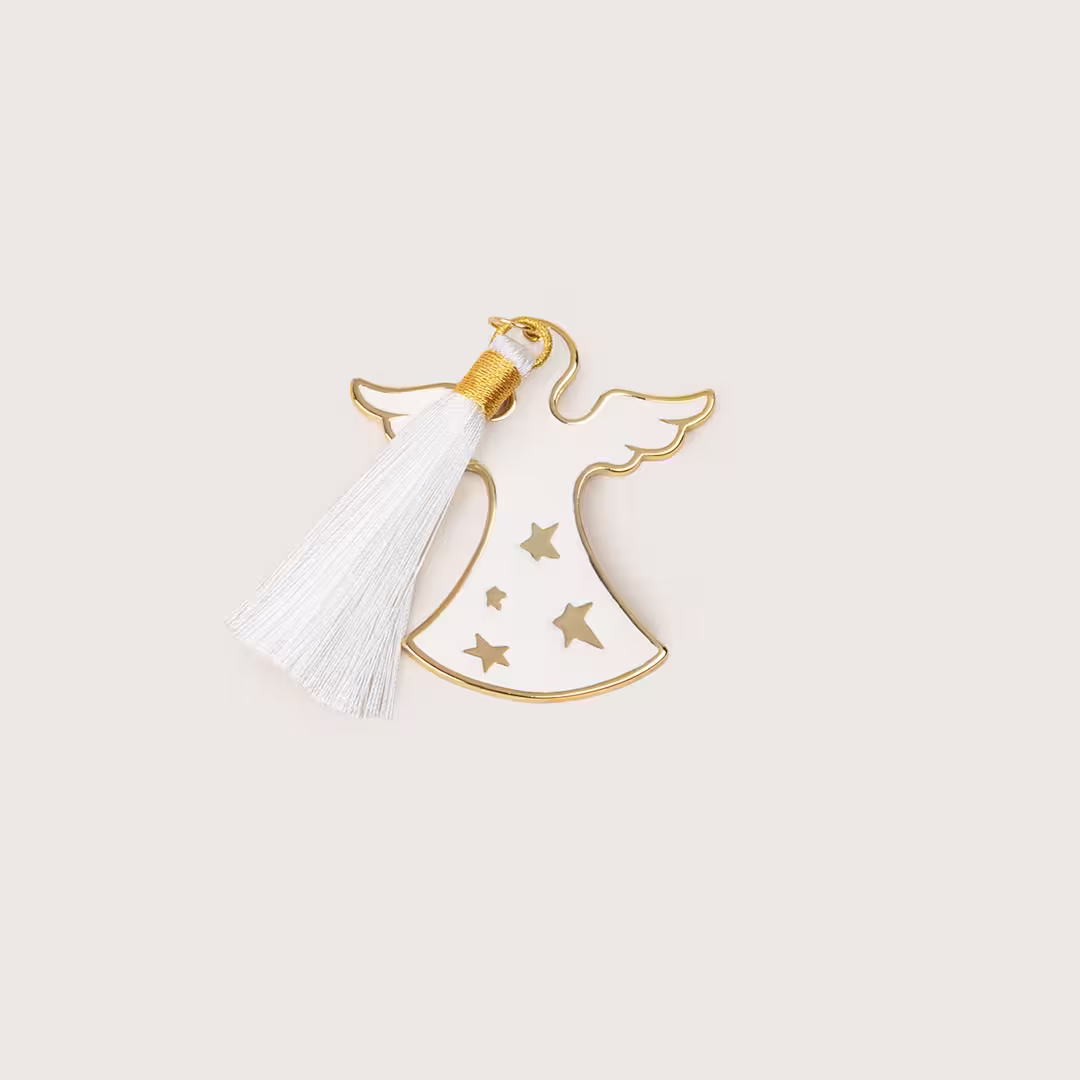Ce porte-bonheur en forme d’ange, en métal doré et émail blanc, est un symbole universel de protection, de paix et de lumière.