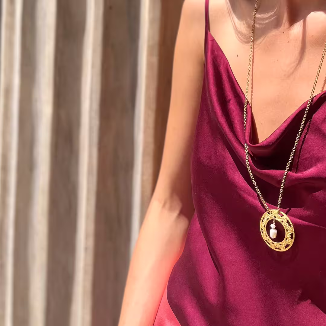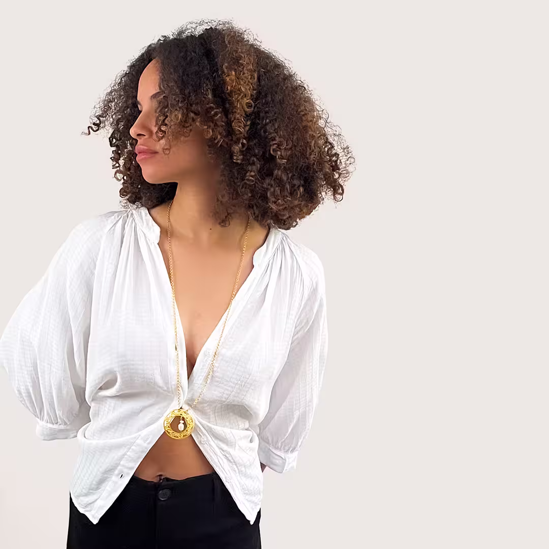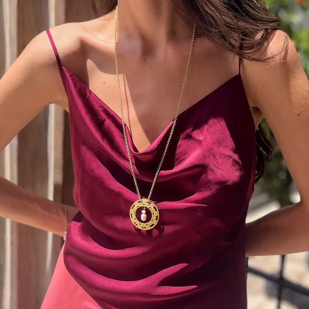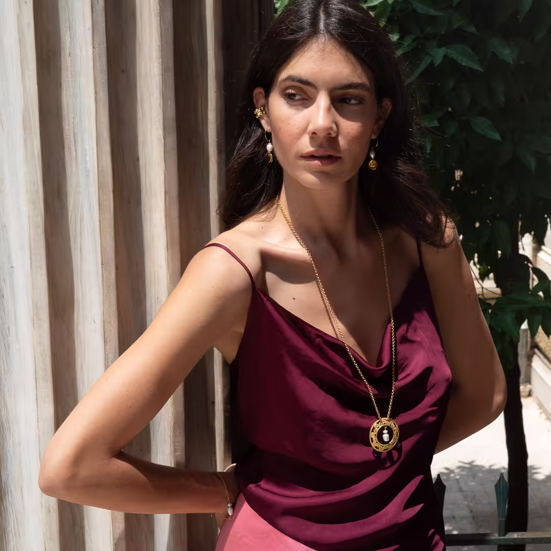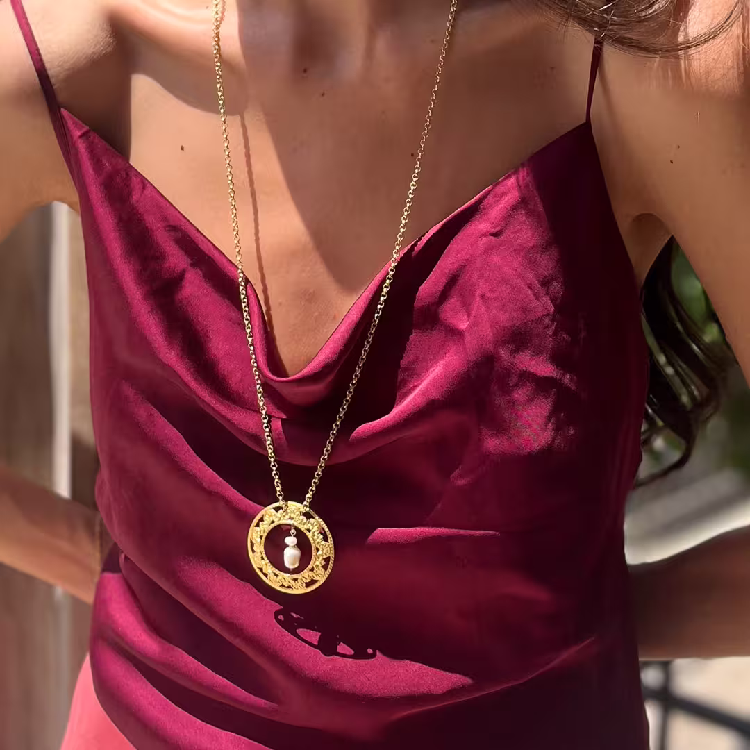Sa jolie chaîne met en valeur une médaille au motif de couronne antique, symbole raffiné de l’héritage grec, toutes deux dorées à l’or fin. Deux perles d’eau douce baroques, uniques par leurs formes irrégulières, y sont suspendues avec grâce et donne à ce bijou unique une lumière singulière. Entre elles, une délicate fleur dorée vient parfaire l’ensemble, apportant une touche subtile et poétique.