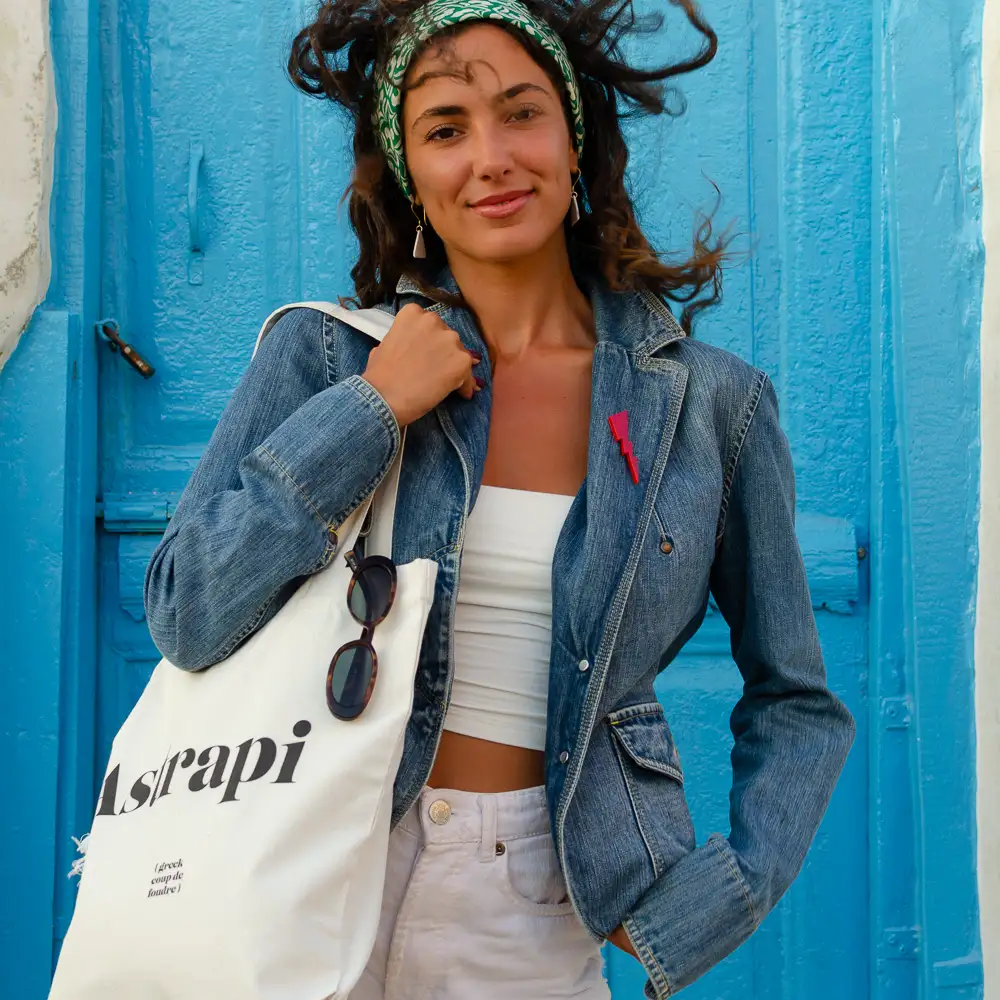 J’ai opté pour un design minimaliste avec un message qui suscitera la curiosité de vos proches. Plus qu’un simple sac en tissu, je voulais vraiment quelque chose d’unique, comme pour mes bijoux ou mes sandales. J’ai choisi des mots grecs, universels et surtout faciles à prononcer, que vous pourrez utiliser lors de vos futures vacances dans les Cyclades. Pour donner encore plus de poids à ces mots, j’ai créé des formes en plexiglass les représentant. Par exemple, un éclair pour le mot « astrapi » qui veut dire éclair/foudre. Puis, j’ai monté ces formes en broches, repositionnables à l’envi, pour en décorer les tote bags. Vous pourrez les utiliser ensemble ou séparément, selon votre inspiration du moment.